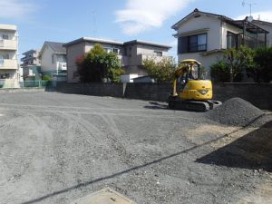 ある程度平にしてから砕石を敷いて、ローラーで転圧していきます。