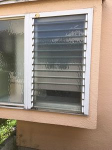 ガラスが動くジャロジータイプです。お子さんが遊んでいてボールをぶつけてしまったそうです。だれもケガしないでよかったです。