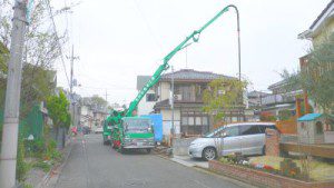 ↑作業分担です。一人がコンクリートを流すホースを持ち、