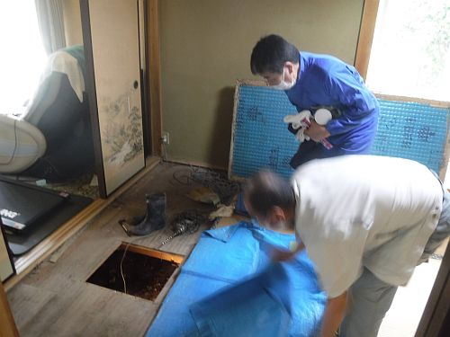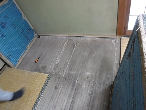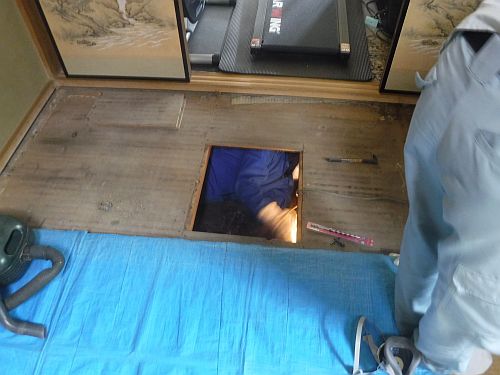 後日、シロアリ処理とお伺いさせていただき、タタミ下の荒床に穴を開け、床下に潜り、床下全体に防蟻処理をさせて頂きました。
