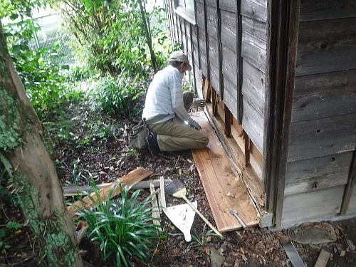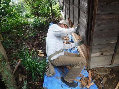 外壁を外して、シロアリ被害を受けている土台、柱、間柱を直していきます。