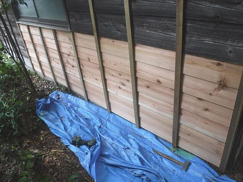継いだ土台、柱、間柱に防蟻薬品を塗布して、新しい外壁を納めていきます。