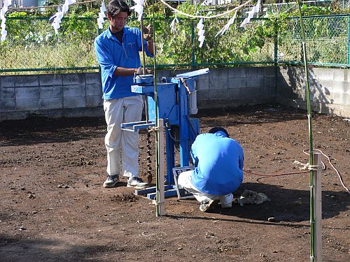 こちらがスウェーデン式サウンディング方式です。一定の重さを鉄の棒に取り付けてどこまで沈むかを確認することで地盤の軟弱度を見ていきます。