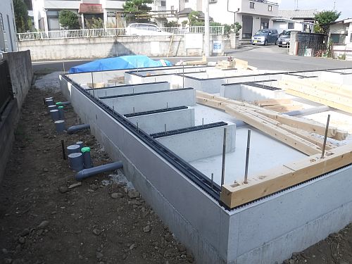 あきる野で新築・リフォーム・2世帯住宅を仕事としているヨコタ総建です。あきる野市で建設中の2世帯住宅が暑さ真っ最中に土台敷きがはじまりました。暑いです。
