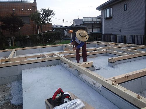 土台を敷き、次に大引と鋼製束を施工していきます。