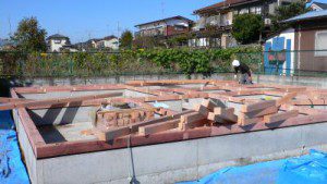 ↑大引きのしたに鋼製束を立てて、11月10日の建前に備えます。