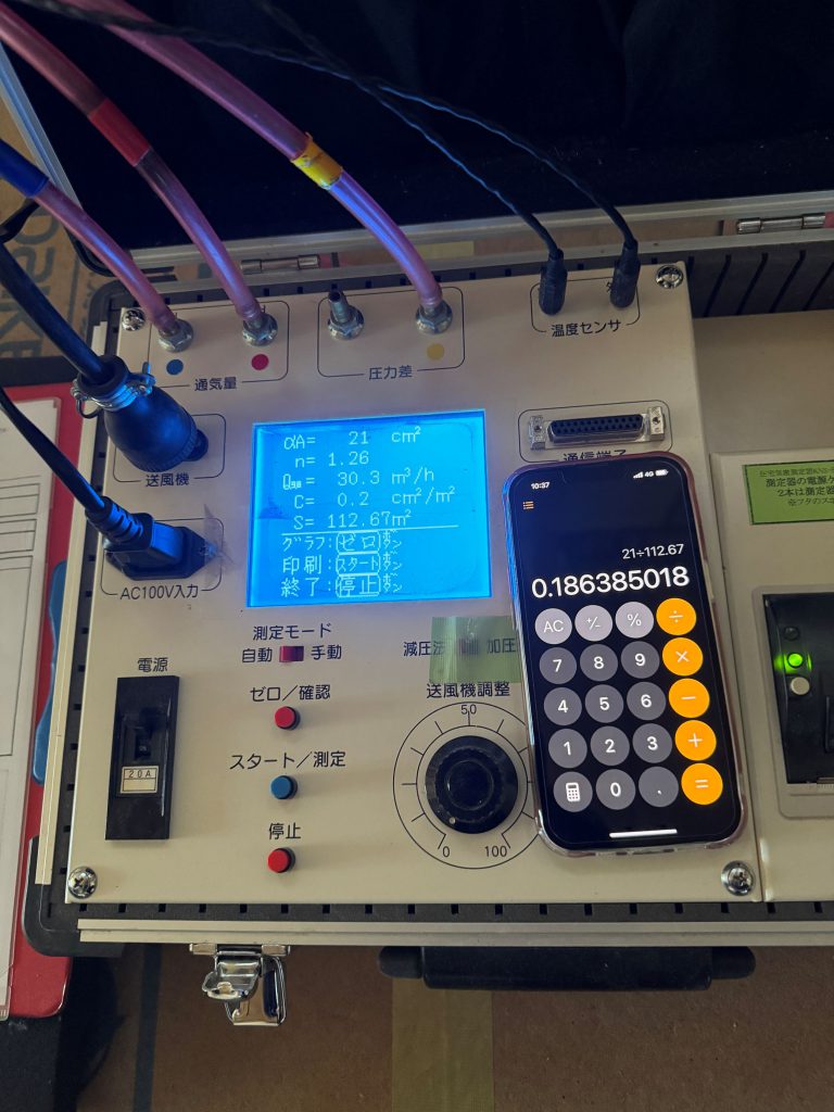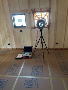 その時に外から室内に入ってくる空気(すきま風)がどれくらいあるかを測定します。