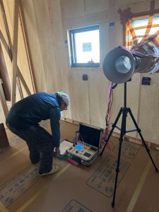 吹付断熱、サッシ・玄関の取付けが終わり気密測定を実施いたしました。