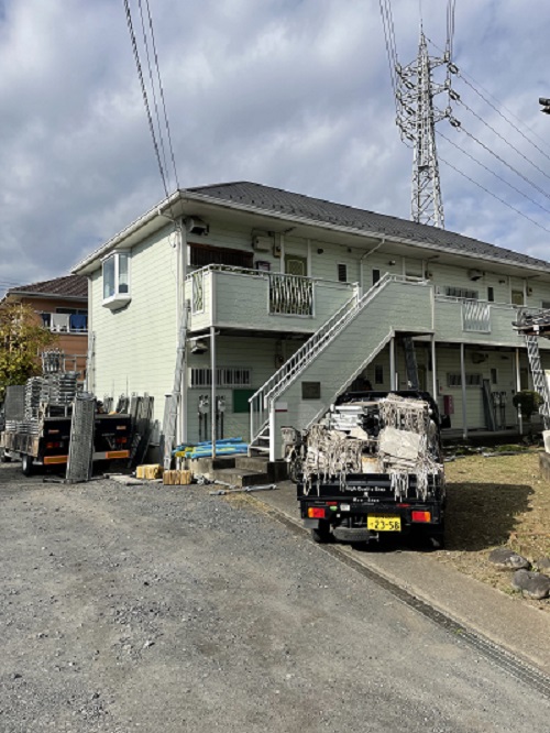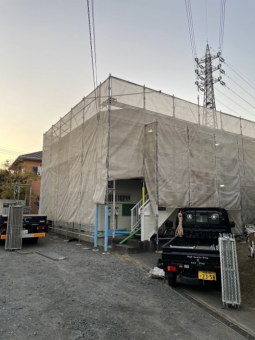 あきる野で新築・リフォーム・2世帯住宅を中心に仕事としているヨコタ総建です。福生市にて集合住宅の外装と修繕工事を進めていきます。本日は足場架けています。