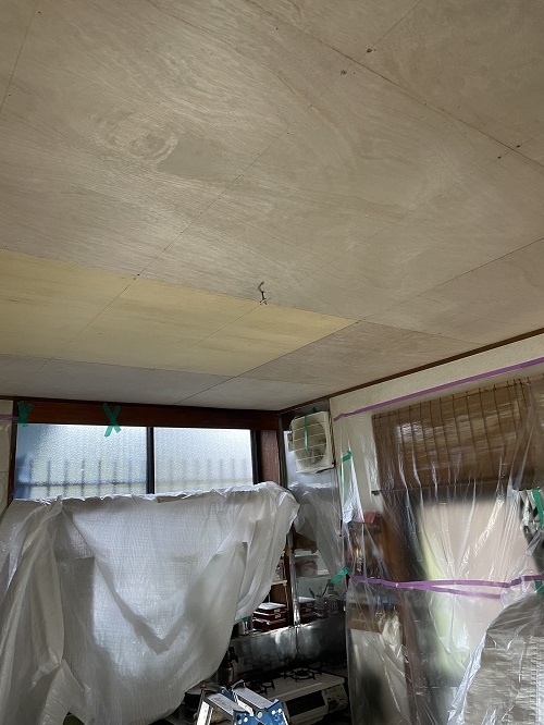 現在、台所の天井がジプトーン材で仕上げてあり、かつ築30年お宅であったため、当初の予定は天井下地からやり直すことを予定しておりましたが、木下地を確認したところ、想像していたよりしっかりしていましたので、ジプトーンははがさず、べニヤを重ねてクロスを仕上げることにしました。