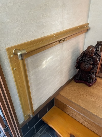 施工後。座って、靴が履き脱ぎできるようにL型に手摺を取り付けてもらいました。大工さんに年末は大忙しで活動してもらっています。ありがとうございます。