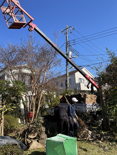 木の裏側で見えないですが、植木屋さんの籠のついたトラックで高い木を上から順番に切っています。