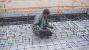 ↑コンクリート打設の際に鉄筋が動かないように、鉄線で鉄筋どうしを連結します。