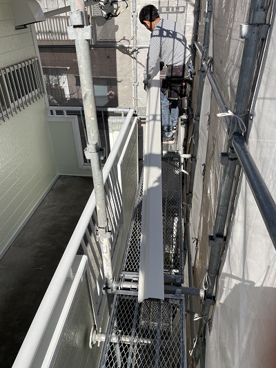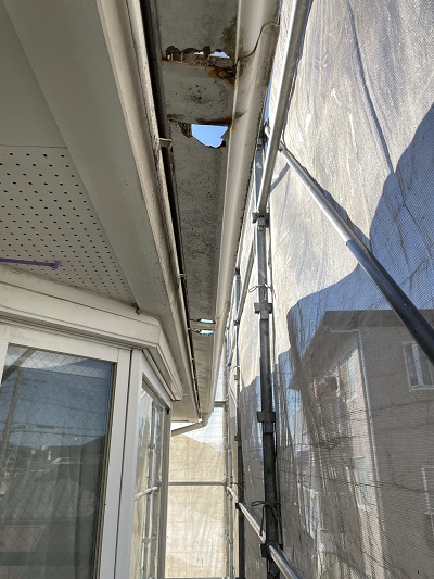 あきる野で新築・リフォーム・2世帯住宅を中心に仕事としているヨコタ総建です。福生市にて集合住宅の外装と修繕工事を進めていきます。軒樋に穴が開いているので交換することになりました。