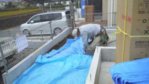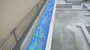 弊社では足場を架ける前に古いブルーシートを足元に敷きます。