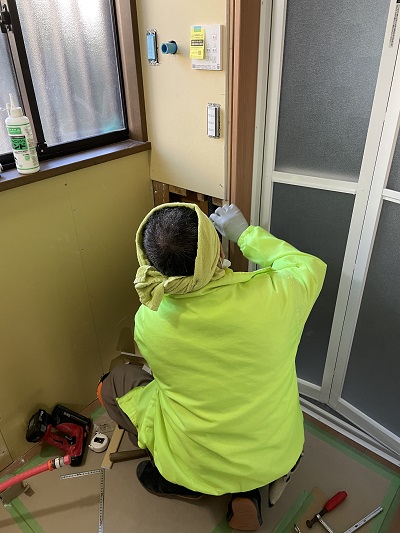 ユニットバスが施工した後にユニットバス出入口枠を施工していきます。出入口寸法の奥行が定かではなかったのでしっかり測り、ぴったしに施工します。