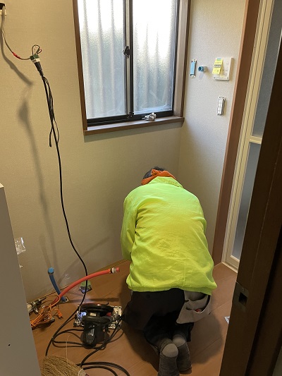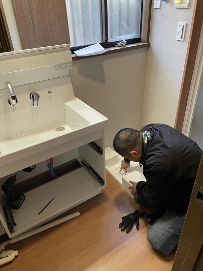 洗面化粧台の給水管、給湯管、排水管を接続して、洗濯排水パンを設置して完成です。通水テストも忘れておりません。問題なくお水、お湯をつなげることができました。