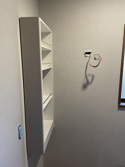 こちらが150㎜の壁掛け洗面収納になります。洗面台の前に立った時に横にあると便利で収納量が増えるということでご提案させてもらい、採用してもらいました。こちらは重宝すると思います