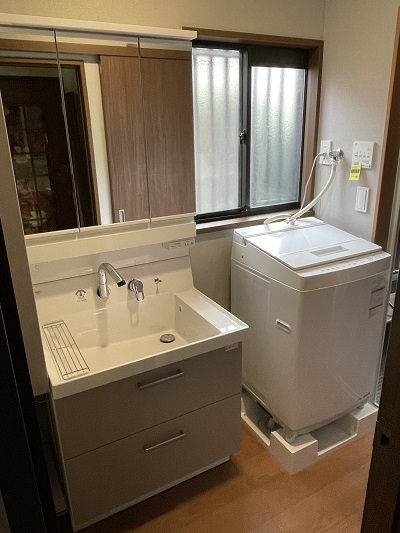 リフォーム後の洗面脱衣室になります。洗面脱衣室の広さは0.75坪ですので、今の一般的な洗面脱衣室より少し狭いですが、洗面化粧台と壁面収納棚を付けましたので収納量はリフォーム前に比べて1.5倍以上になりました。以前の洗濯機スペースは洗濯排水が床直接だったため、無駄なスペースができてしまい、片付けにくかったとおもいますが、今回は洗濯排水パンをつけましたので、洗濯置き場としてスペースを無駄にせず、洗面化粧台と洗濯機の間にまとめたすき間ができましたので、細い金網ラックがおけるようになり、こちらも収納量と簡単に片づけられるようになったと思います。また、万が一洗濯排水管が外れても洗濯パンが受け皿の役割を果たすので、お水が床にこぼれることがありません。洗面脱衣室の出入り口扉も開き扉から引戸にかえましたので洗った洗濯物を取り出すときもスムーズになりました。限られたスペースでとても有効に導線と工夫ができたと思います。水廻りリフォームも残りトイレだけとなりました。もう少しヨコタ総建とお付き合いください。