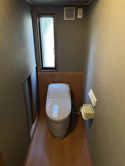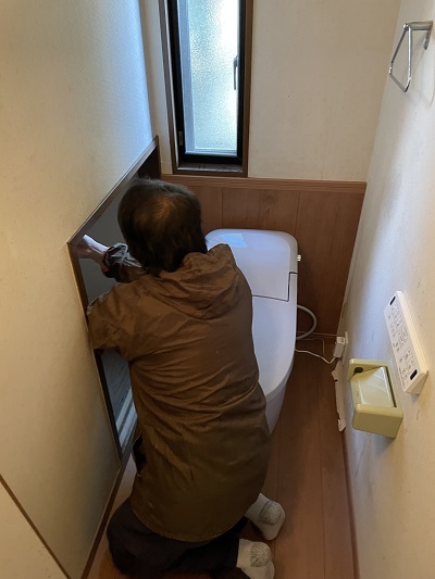あきる野市で注文住宅、リフォーム、建て替え、耐震改修等を仕事にしている地元工務店のヨコタ総建です。約2週間かかりましたが本日で水廻りリフォームの完成となるトイレリフォームクロス張りになります。トイレ自体は1日で使えるようにしましたがトイレリフォームが完成するのに2日かかりました。