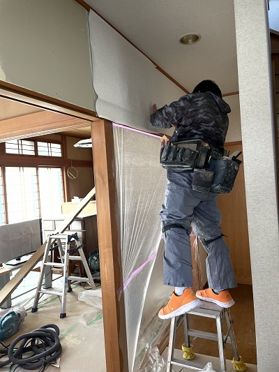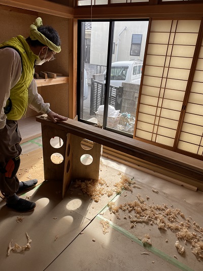 あきる野市で注文住宅、リフォーム、建て替え、耐震改修を中心に仕事をしている地元工務店のヨコタ総建です。中断していた畳の続き間からフローリング床材のワンルームするリフォームを7日から再開しました。玄関木枠がシロアリ被害を受けてましたので取り換えることになりました。節の目立たない木材を取り寄せて、現地で加工を行いました。