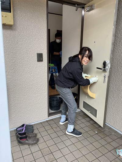玄関扉もクリーニングして3人で1日作業です。肌寒い中ありがとうございます。やはりプロの仕事は違います。本当にキレイになりますね。いつもコツを教えてもらっています。
