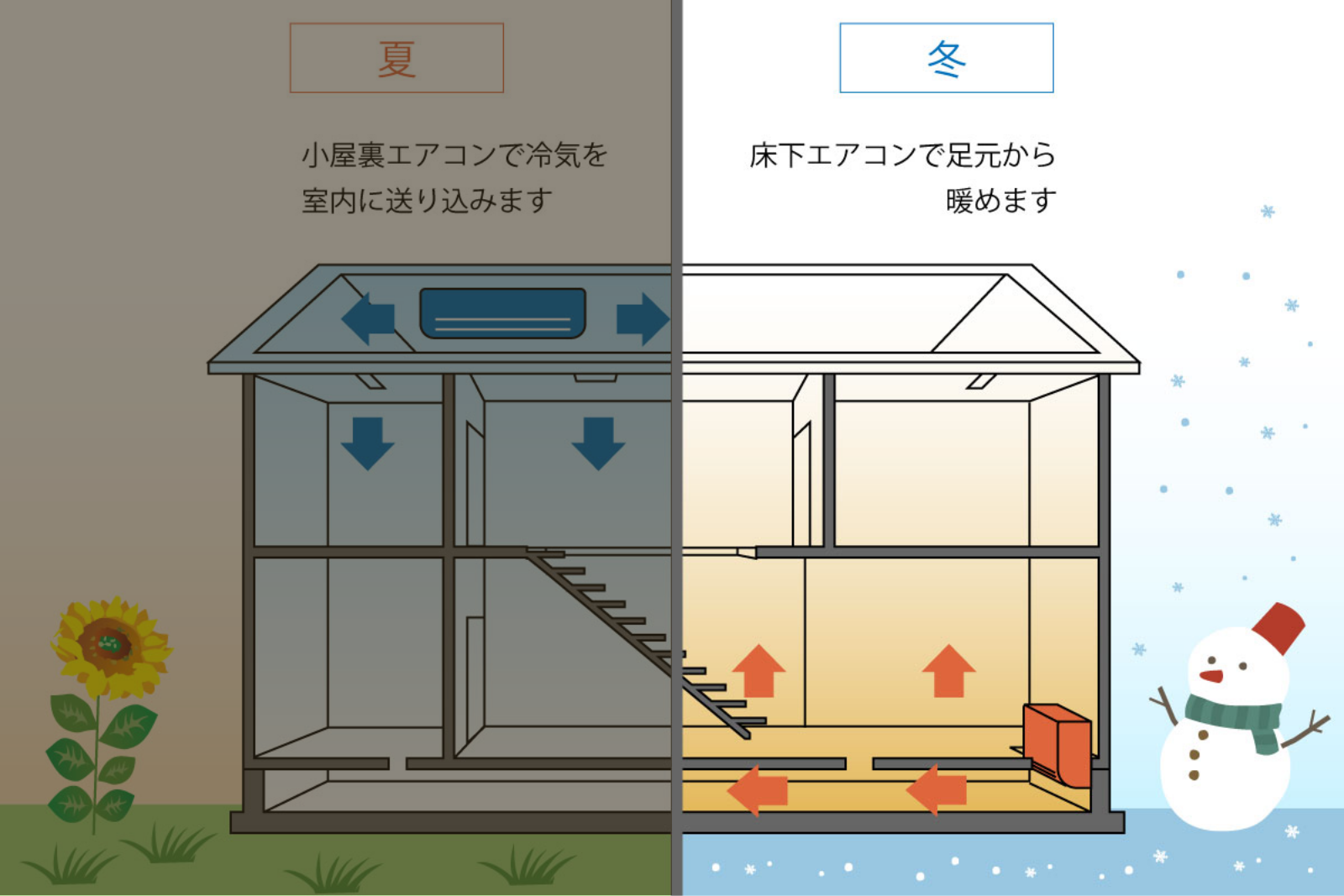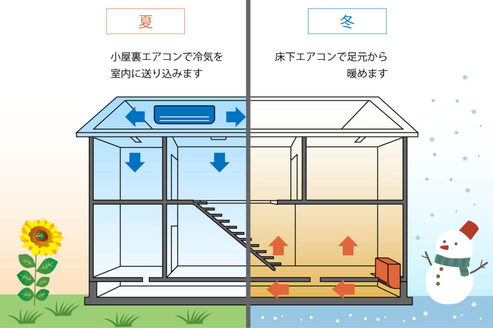 暖かい空気が上にのぼりやすい性質を利用し、床下から部屋全体を暖めます。
