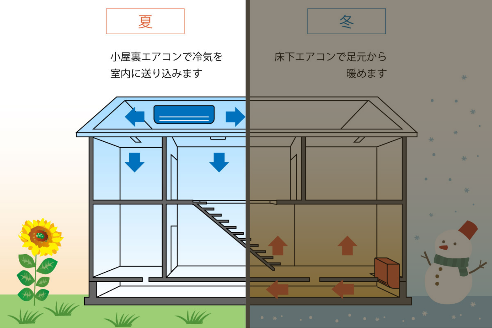多くの場合、各部屋に個別のエアコンを設置することで一時的に問題は解決されますが、これには高額なコストがかかり、高性能住 宅では必要以上の能力過剰になるリスクがあります。さらに、エアコンの外観が外装を損ね、配管や室外機が目立つ問題もありま す。これらの対策として、当社では「小屋裏エアコン冷房」の手法を採用しています。この方法では、小屋裏に設置した一台のエアコンで全居室を冷やすことができ、均一な室温を保つことが可能です。また、高断熱・高気密の設計により、夏場でも冷房費用を大 幅に削減できます。