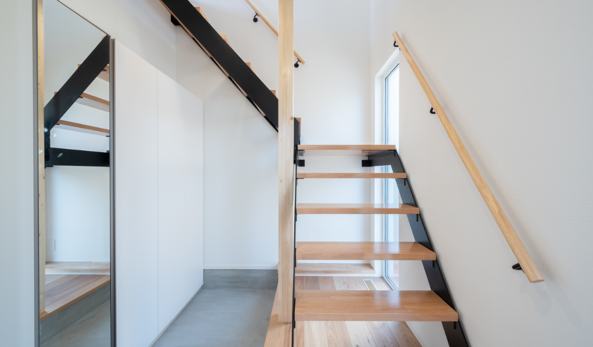 無駄を排し、暮らす人たちがつながる開放的なスペースをつくるオープン階段。鉄骨のシンプルなデザインと、マテリアル感がスタイリッシュな空間と一体感をつくっ てくれます。