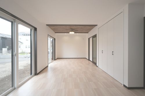 とても広いLDKです。リビングの天井は化粧梁で見せポイントを作りました。