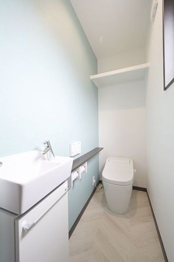 ヘリボーン柄のクッションフロアと水色の壁紙がいいです