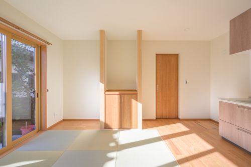 建坪に限りがあるので、リビングとダイニングを兼用にして、半畳タタミを敷き、座って生活するようなかたちにしました。