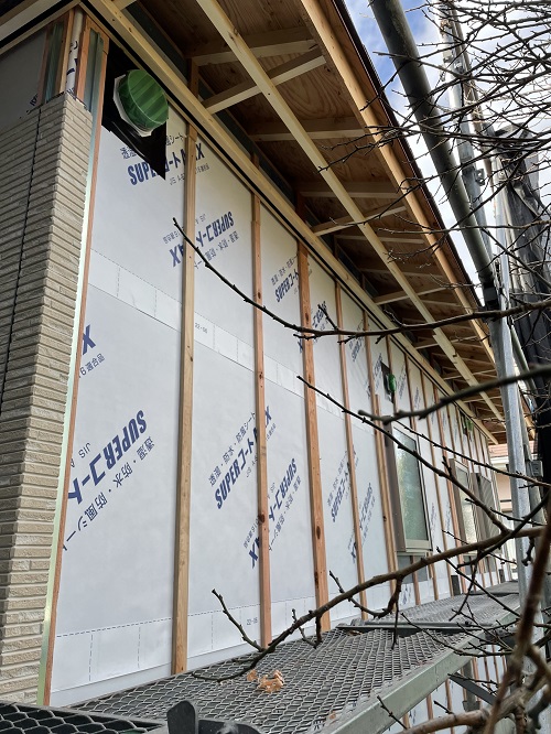 サイディングを仕上げる前に通気胴縁、その前透湿シートと下準備が必要です。貫通部にも防水パッキンと防水テープで家の中に雨が入らないようにしておきます。