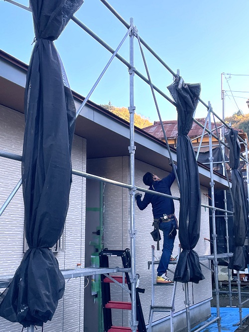 細かいキズ等、確認してコーキング屋さんにバトンタッチします。このサイディング柄は素敵ですね。
