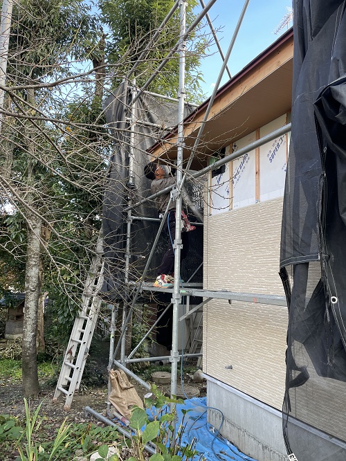 あきる野で新築・リフォーム・2世帯住宅を中心に仕事としているヨコタ総建です。青梅市にて新築平屋の建築中です。外壁(窯業サイディング)と木目柄の軒天工事がひと段落しました。